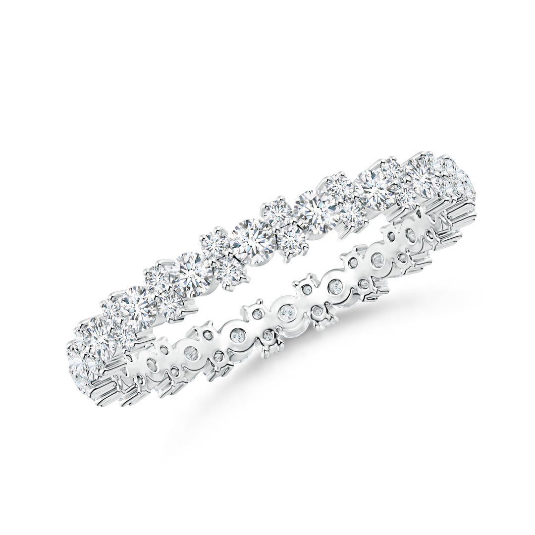 This breathtakingly beautiful eternity ring showcases its classic design with an elaborate twist. It is crafted in 14ct white gold with the dazzling diamonds mounted in prong settings. The beautiful arrangement of the round diamonds appears like a shimmering garland and draws attention to its exquisiteness.