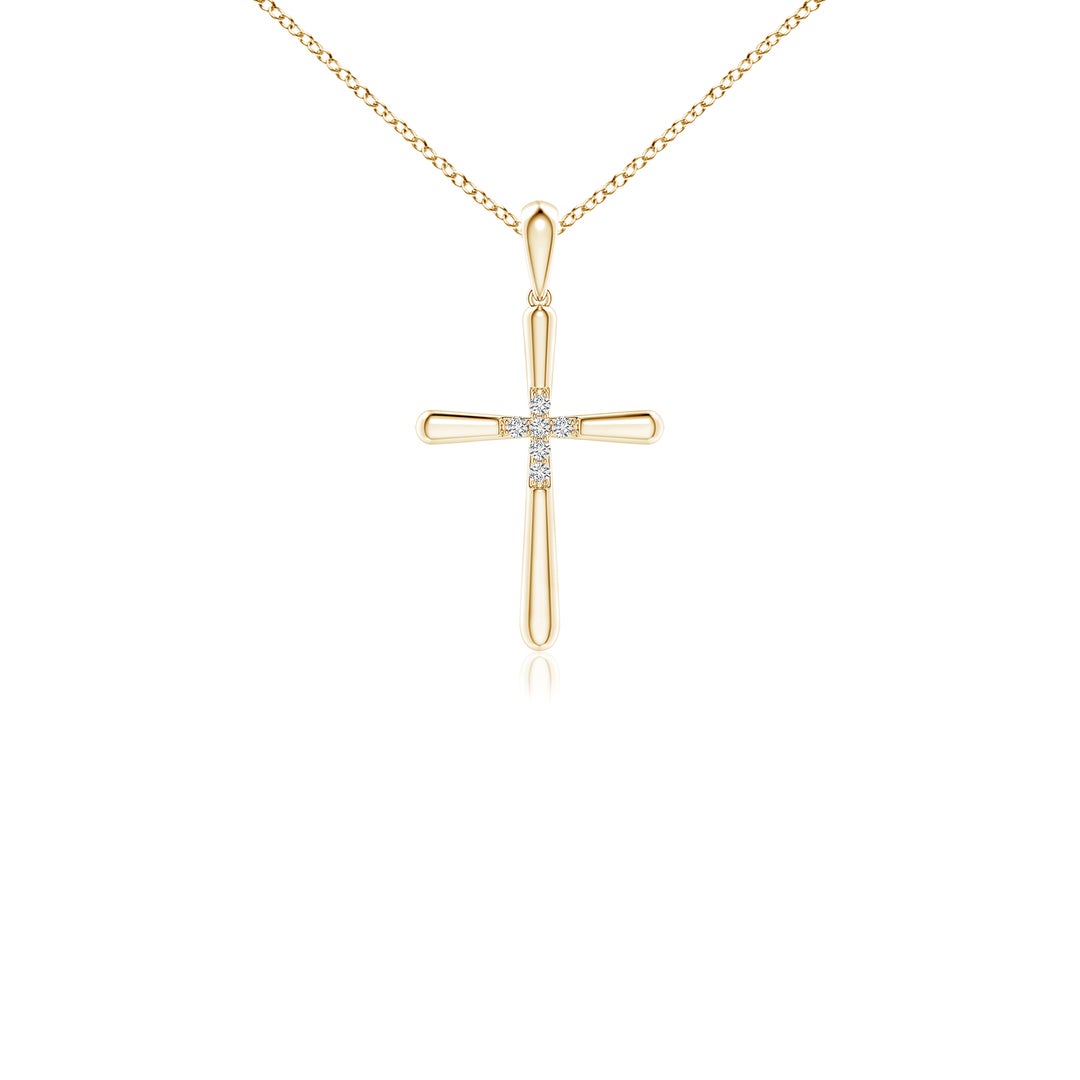 Show your love and commitment to God with this gorgeous fluted cross pendant in 14k yellow gold. It has a polished finish and displays a slightly tapered design. Glittering diamonds form a cross at the centre of the pendant.