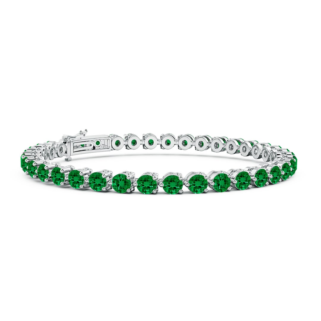 This tennis bracelet features a series of lab-grown round emeralds, linked together in prong settings. A lobster claw clasp secures this beautiful 18k white gold bracelet.