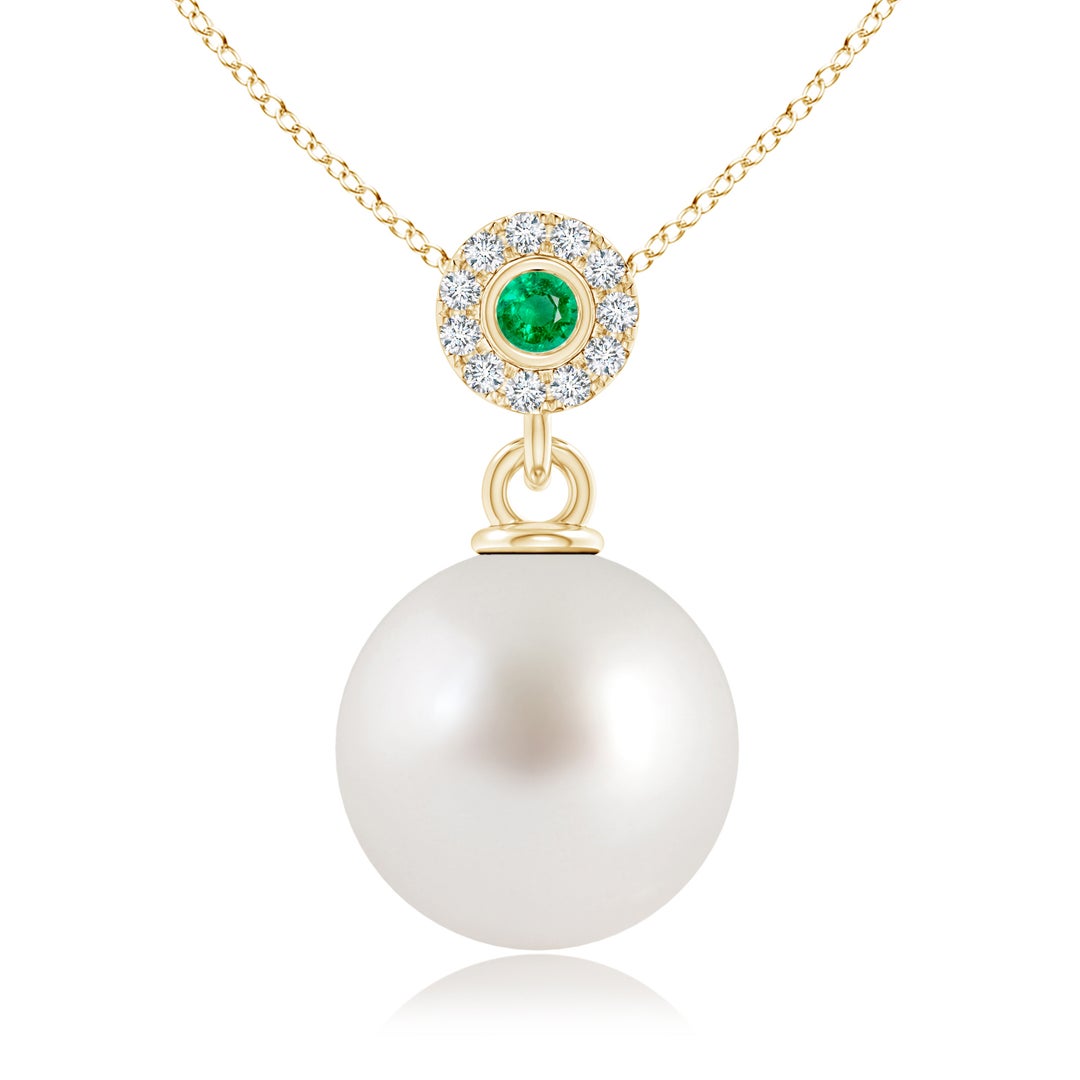 Encircled by a halo of diamonds is a bezel-set emerald on the round bale of this dangling pearl pendant in 18k yellow gold. The lush green emerald and the diamonds lend a luxurious edge to this elegant South Sea cultured pearl pendant.